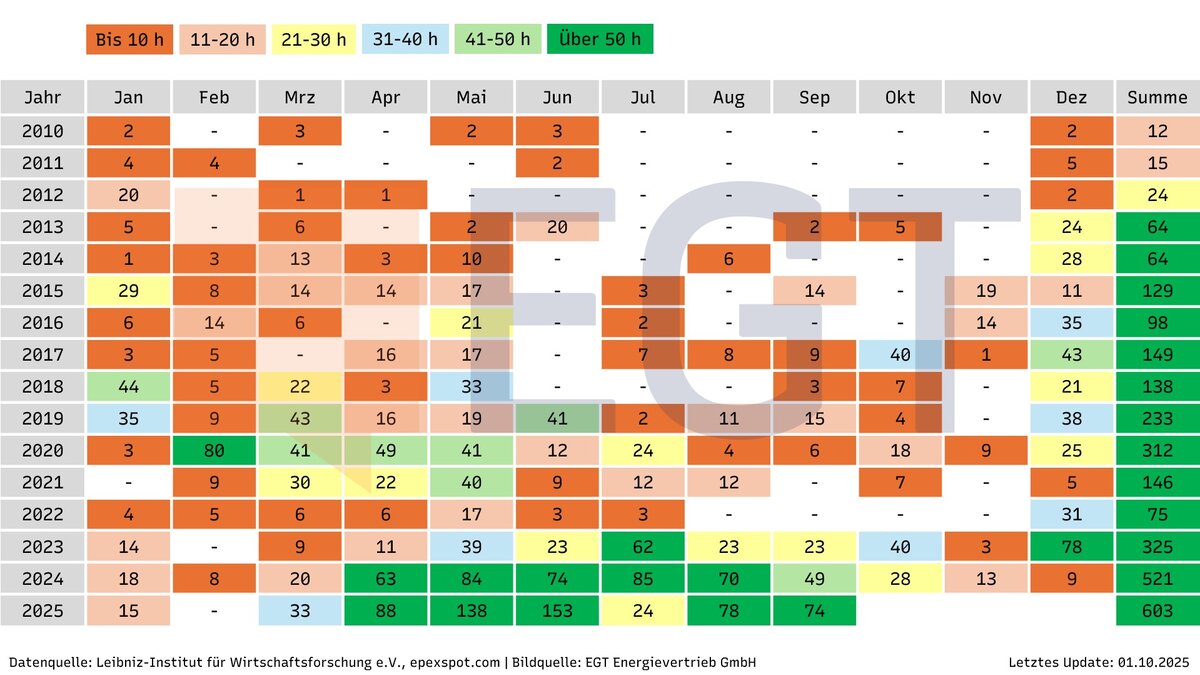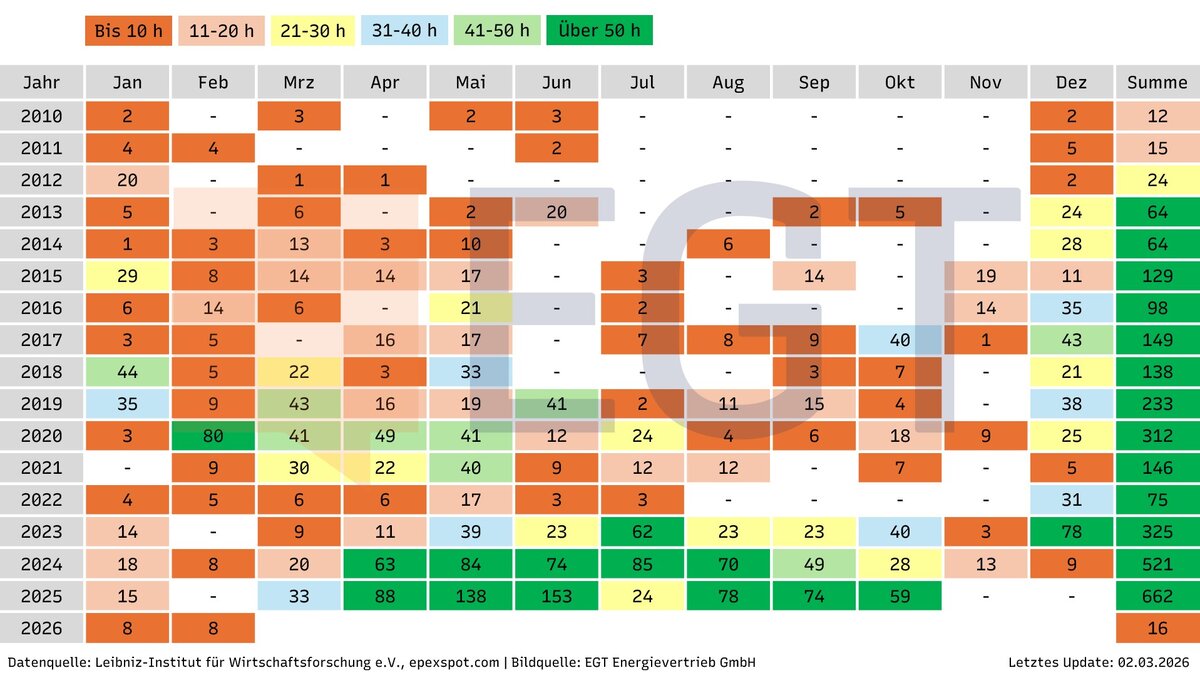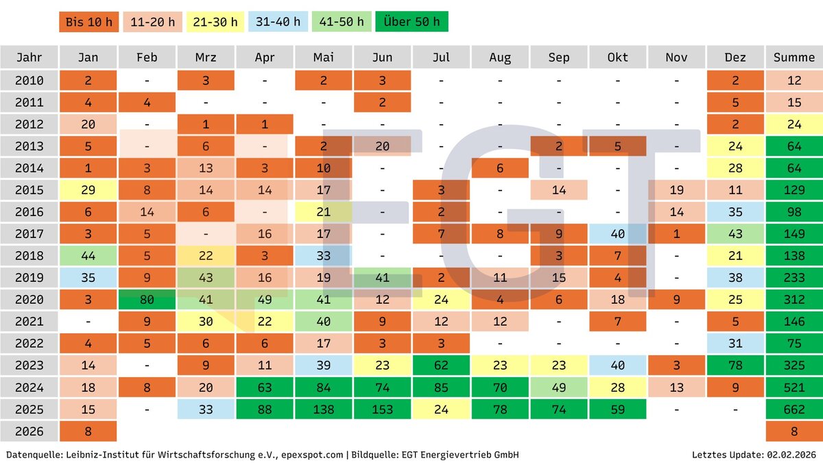 Wie sich die Anzahl an Stunden, die es zum Nulltarif oder sogar zu negativen Preise gibt, in den letzten Monaten und Jahren entwickelt hat, entnehmen Sie der obigen Heatmap.