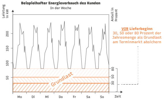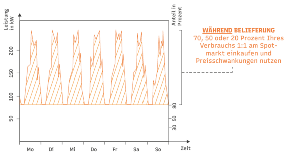 Mit Spot Plus decken Sie einen Teil Ihres Bedarfes über die Vorabbeschaffung am Terminmarkt ein. Der Rest wird tagesaktuell über den Spotmarkt eingekauft. Der große Vorteil: Sie streuen Ihren Einkauf und minimieren gleichzeitig Ihr Einkaufsrisiko.